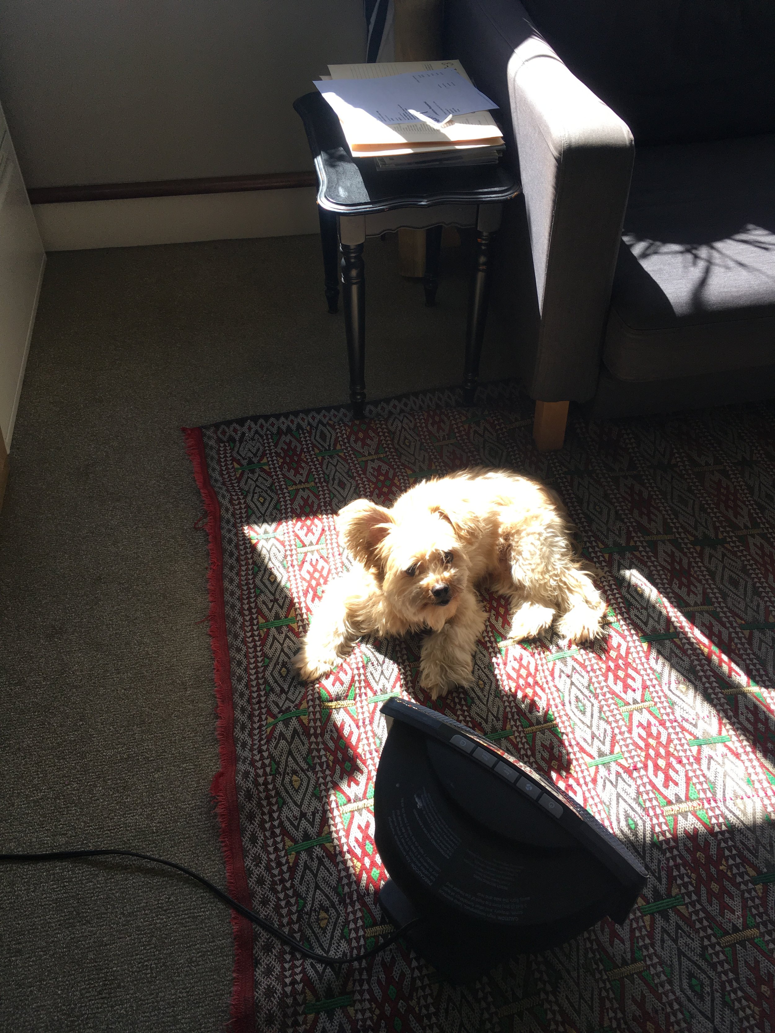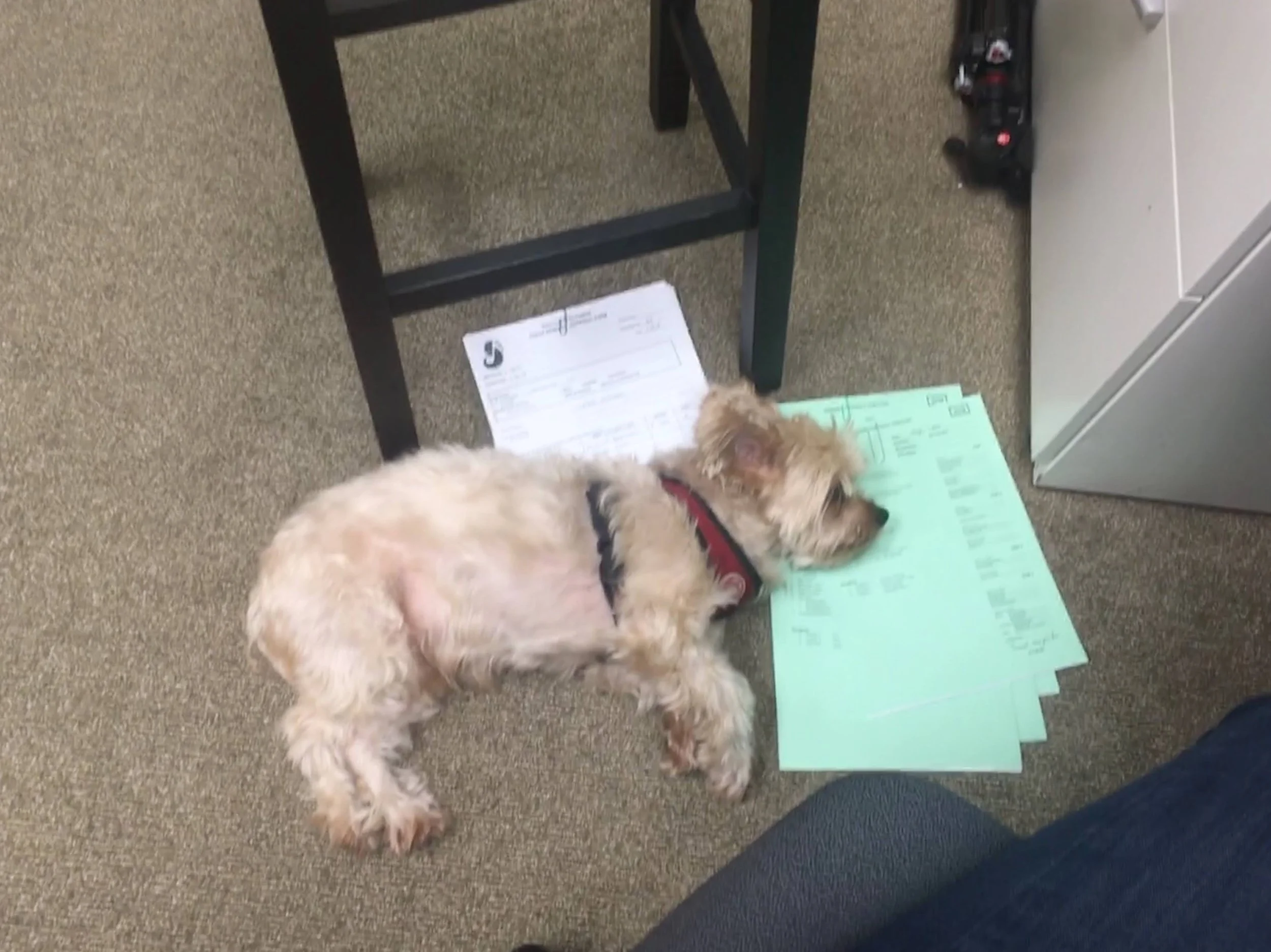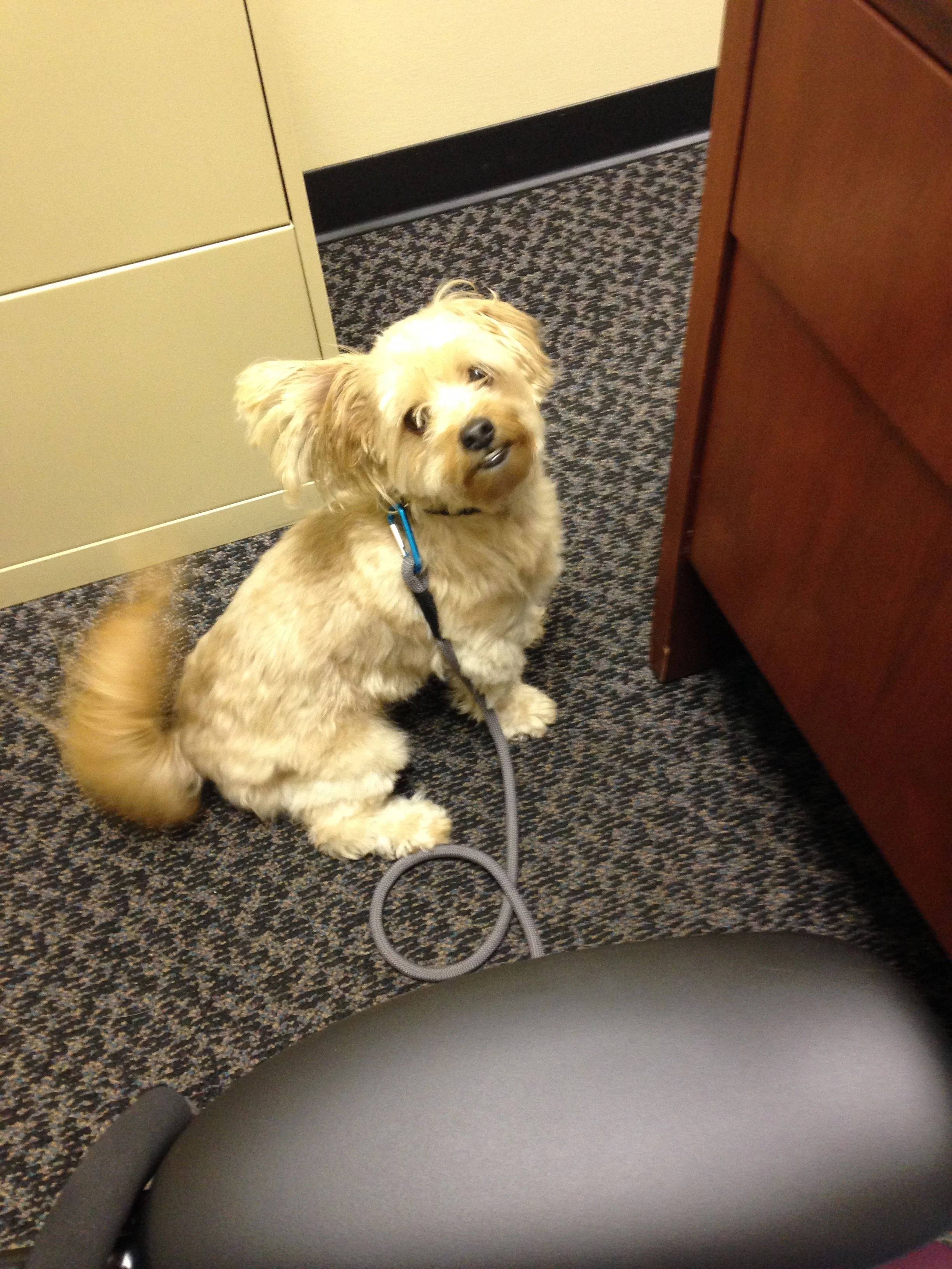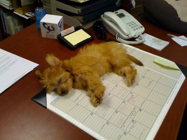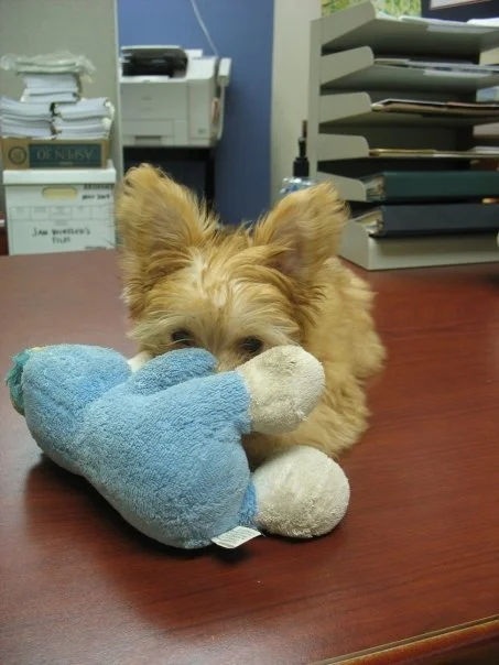From the first week we had him, when he fell asleep on my desk at UGA, Chewy became my furry little coworker. Thus began many years of Chewy accompanying me to work. He loved the people he got to see, and he especially loved that all my workplaces had carpet. Our “Ball Down the Hall” game was especially fun in the long hallway at SMF. He even had “work friends,” Alfie and Max.