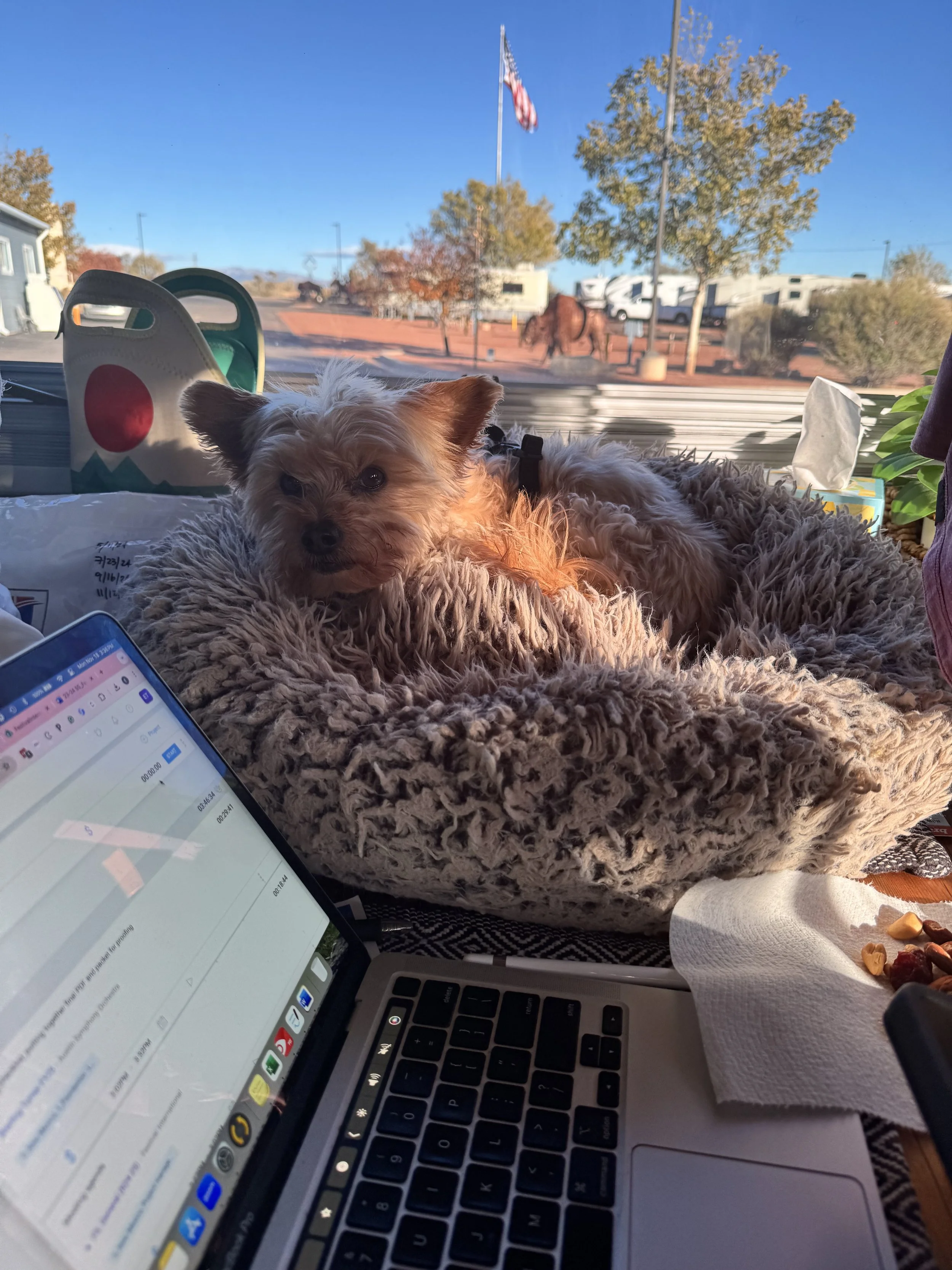 When we hit the road full-time, I can’t say Chewy was very happy about leaving Savannah (which we joked was his retirement home), but he was delighted to have me 100% of the time. We learned early on that he loved to have his bed in the sunny front window of the RV, which meant he was my right-hand man (literally) most days.